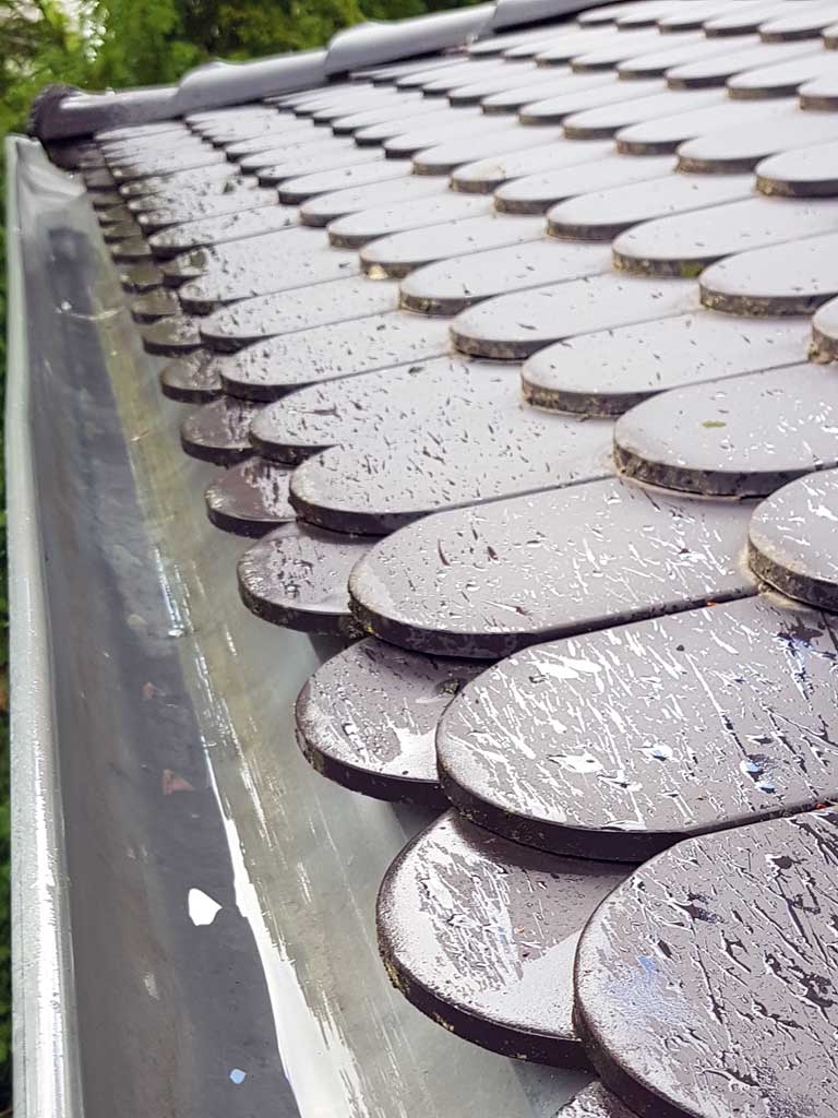 Frisch gespülte Regenrinne nach einer gründlichen Dachrinnenreinigung in Hamburg. Detaillierte Ansicht einer Regenrinne nach abgeschlossener Spülung. Das ist fachmännische Regenrinnenreinigung von Haus und Garten.