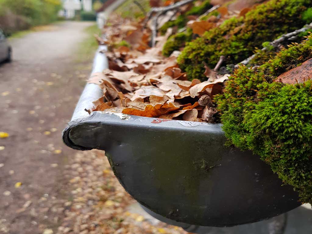 Eine verstopfte Dachrinne einer Garagengemeinschaft in Hamburg vor Durchführung einer professionellen Dachrinnenreinigung.